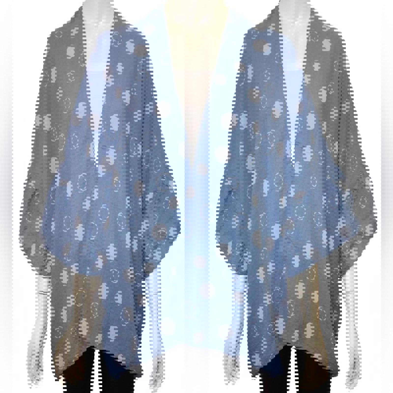 Stylish blue kimono cardigan with white polka dots. Perfect for layering.