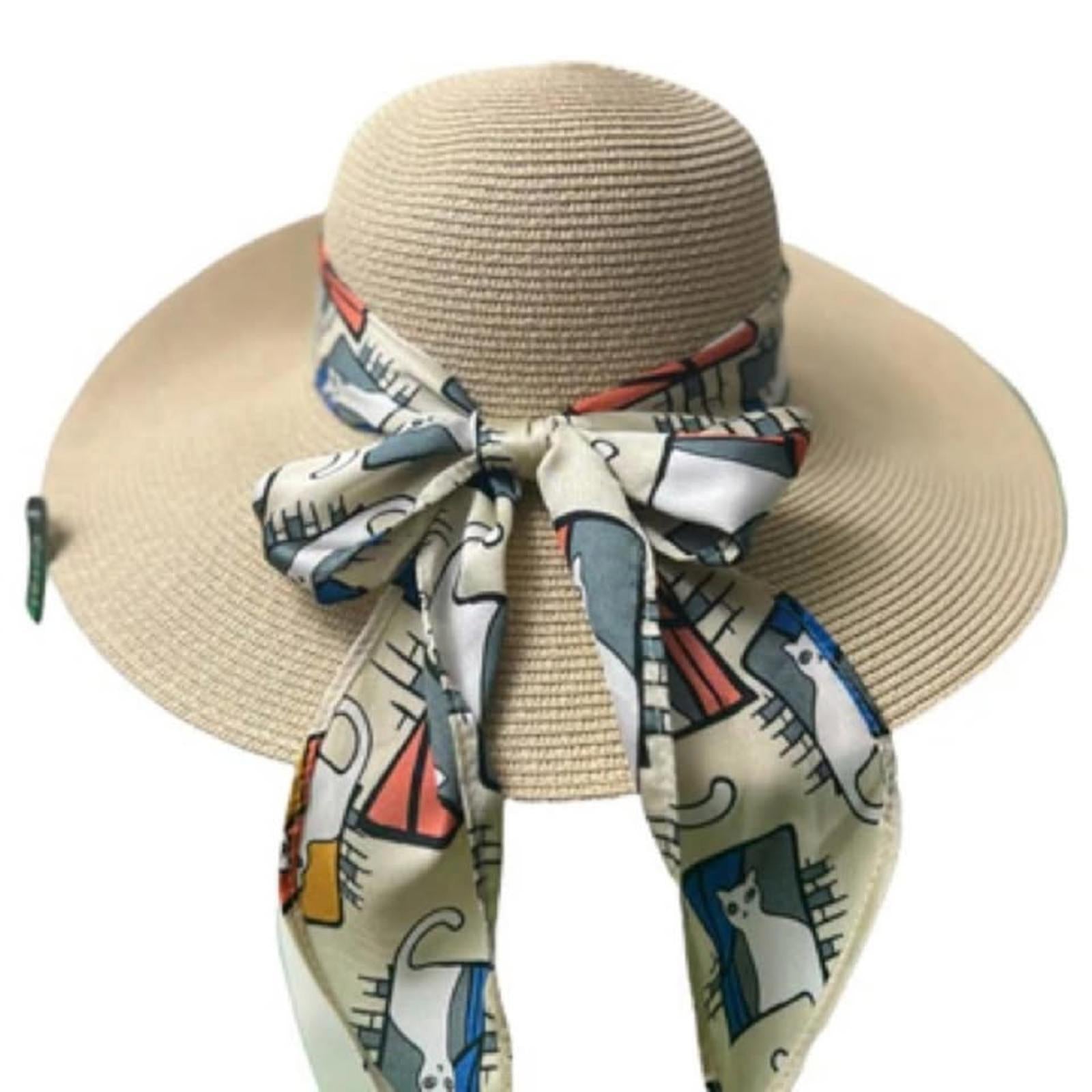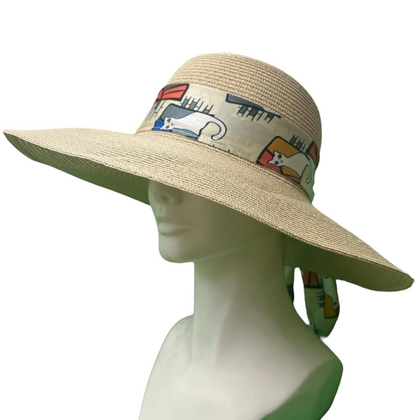 Stay chic and protected from the sun with this fashionable wide-brim sun hat. Featuring a soft beige straw construction, this hat is embellished with a playful cat print scarf that adds a touch of personality. Perfect for garden parties, beach outings, or casual strolls, this hat is designed for both style and comfort. Enjoy the breathable material that keeps you cool and the charming design that makes it easy to pair with any summer outfit. 💛